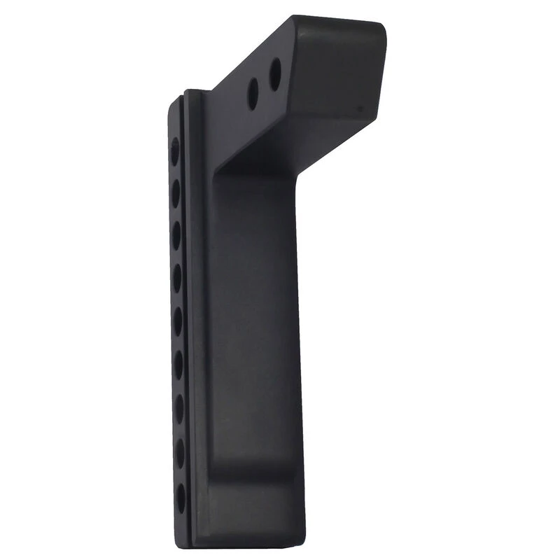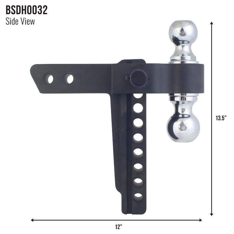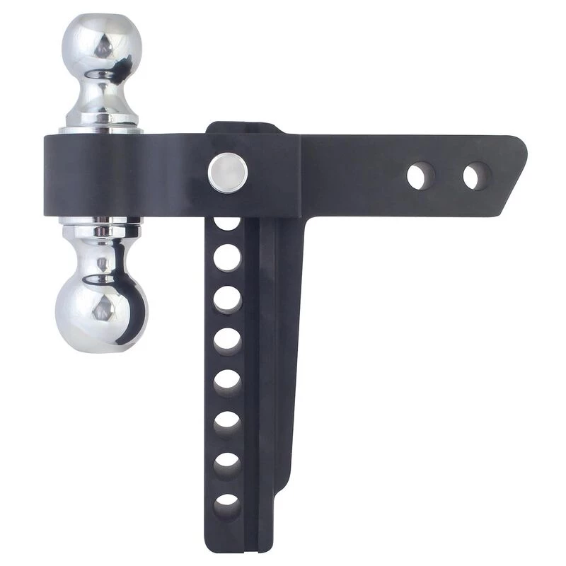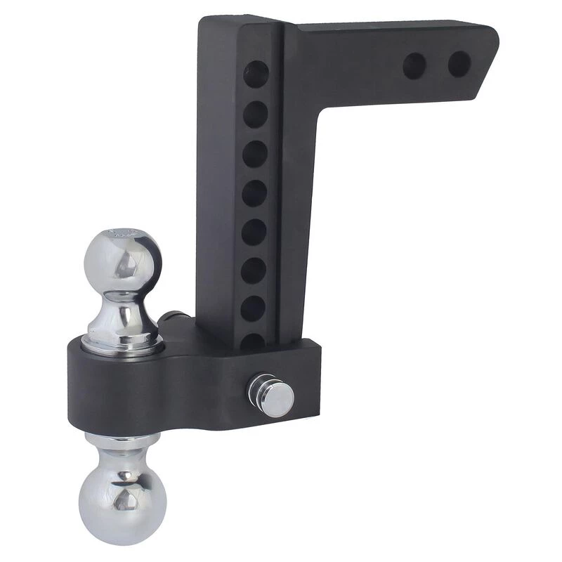Trailer Valet Blackout Series Adjustable Drop Hitch with a 2 inch and 2-5/16 inch Ball and a 0-8 inch Drop. This drop hitch has a weight capacity of 10,000 lbs and is topped with Trailer Valet’s Signature Wrinkle Black Powder Coating (700-hour corrosion resistance rating) for strength and durability while towing.